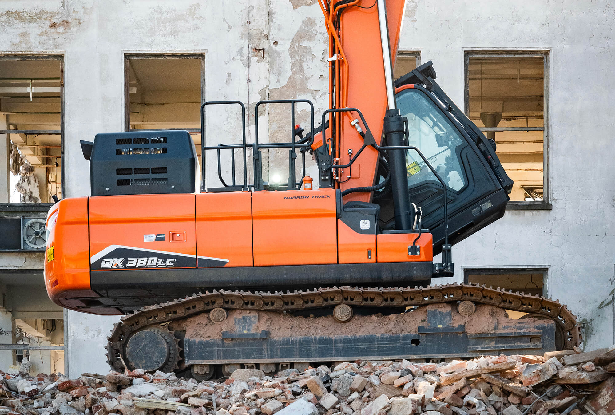 Dizajn s viacerými ramenami na modeli DX380DM-7 zvyšuje celkovú flexibilitu. Tento inovatívny dizajn umožňuje jednoduchú zmenu medzi demolačným výložníkom a výložníkom na zemné práce na vykonávanie rôznych typov prác na rovnakom projekte s použitím rovnakého stroja. DX380DM-7 si zachováva aj hydraulicky nastaviteľný podvozok, ktorý sa vysunie do maximálnej šírky 4,37 m, aby poskytoval optimálnu stabilitu pri práci na demolačných miestach. Šírka podvozku sa dá v polohe úzkej šírky hydraulicky zasunúť na 2,97 m pre ideálnu prepravu.