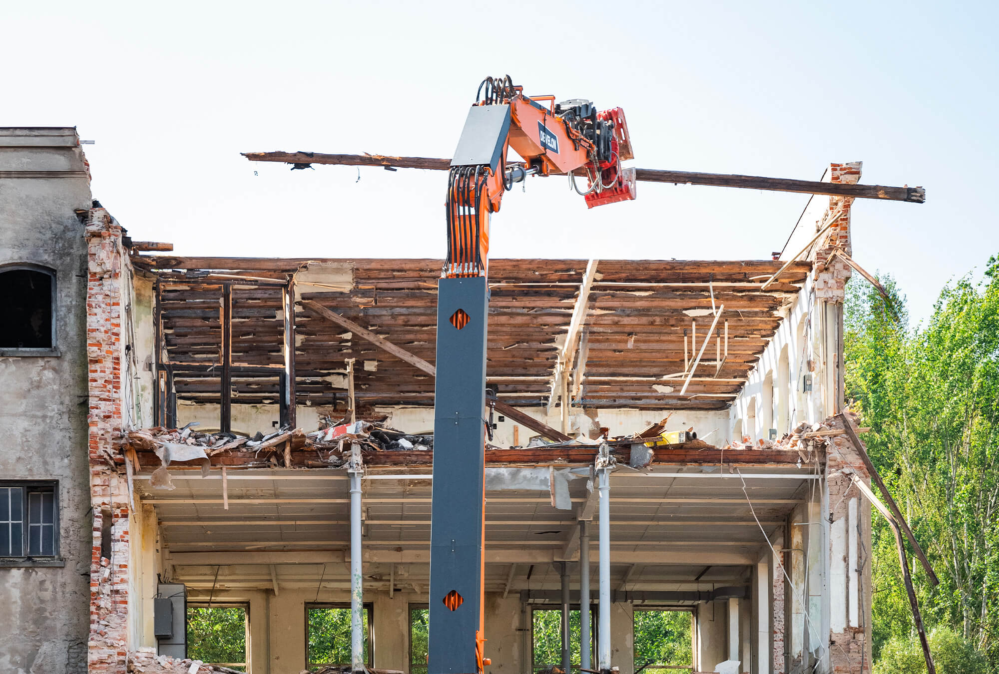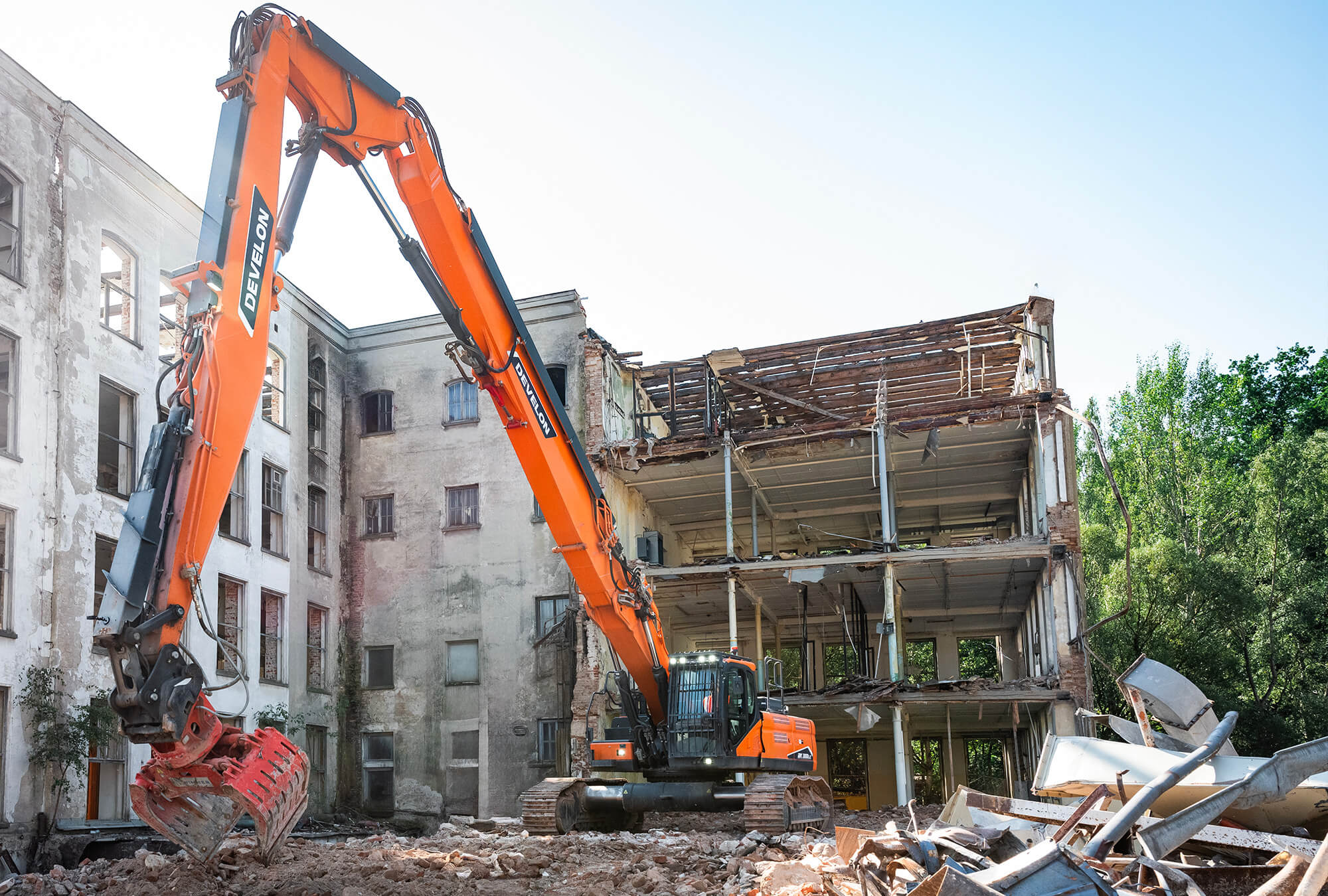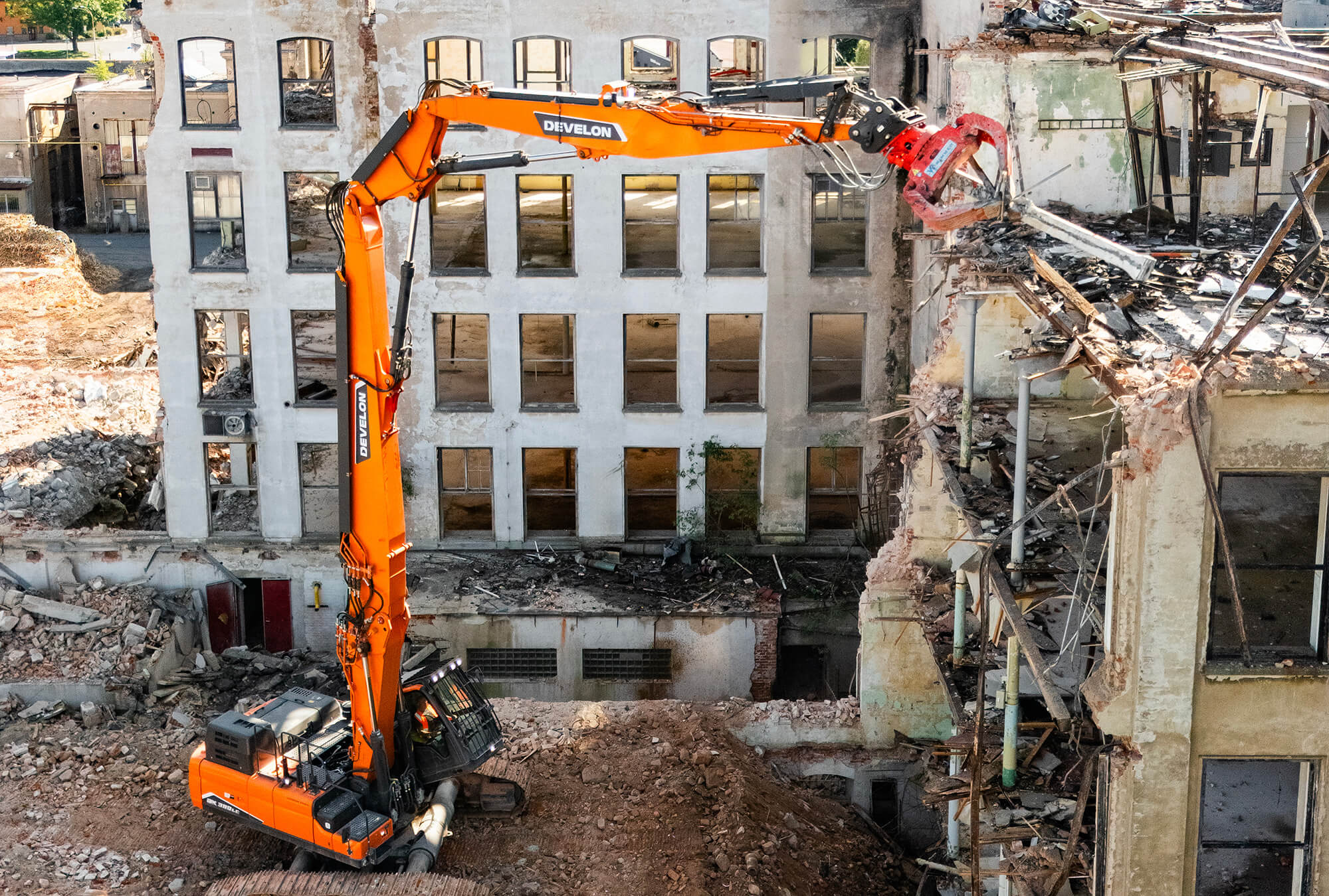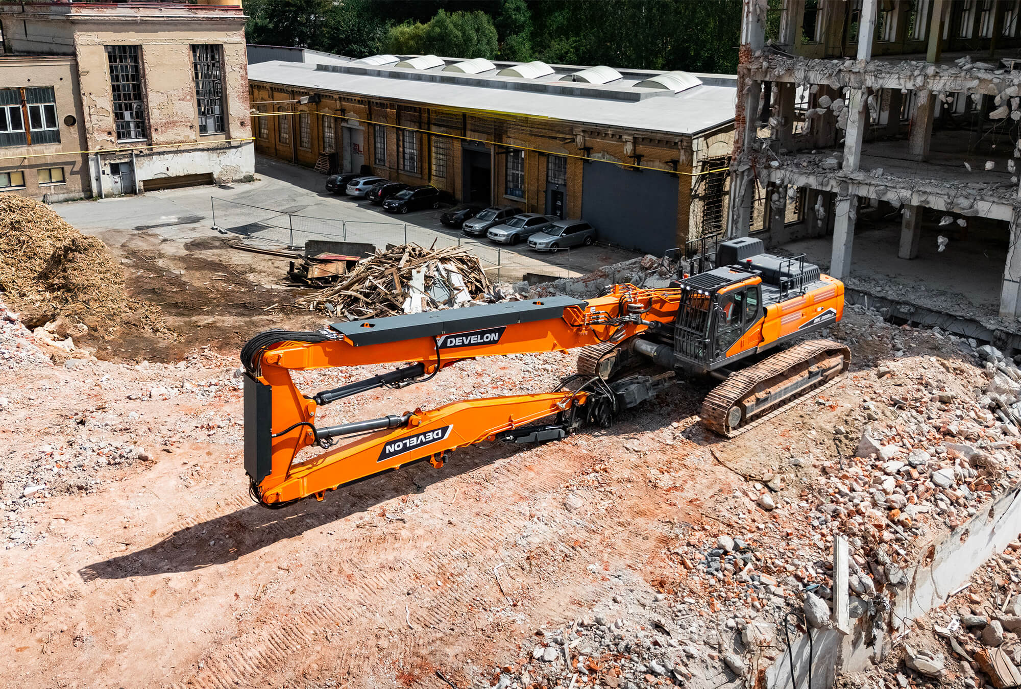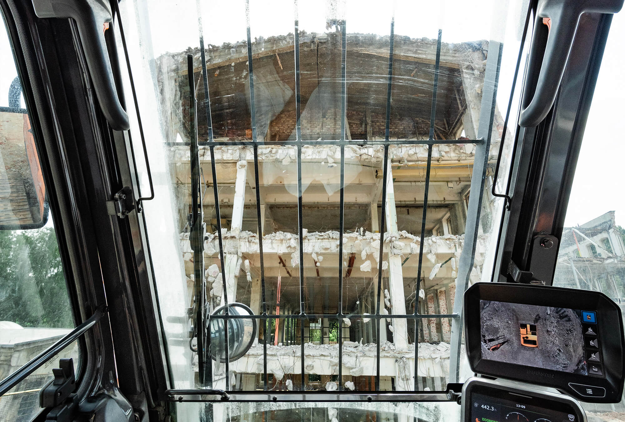 Demolačné rýpadlo Develon DX380DM-7 ponúka operátorovi vynikajúce prostredie obzvlášť vhodné pre demolačné aplikácie s vysokým dosahom s uhlom naklonenia 30 stupňov.