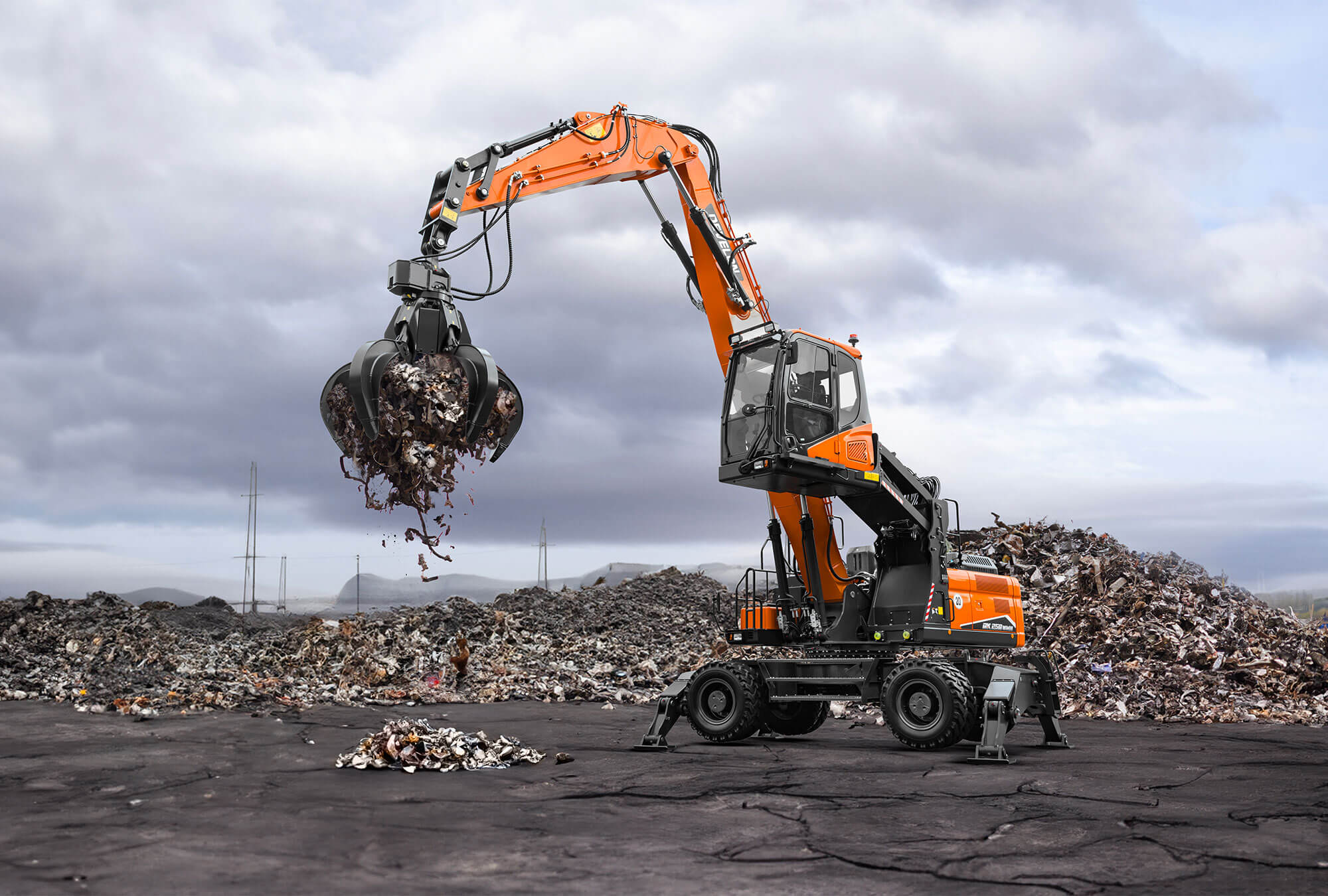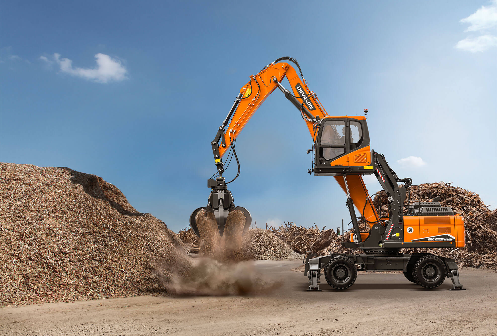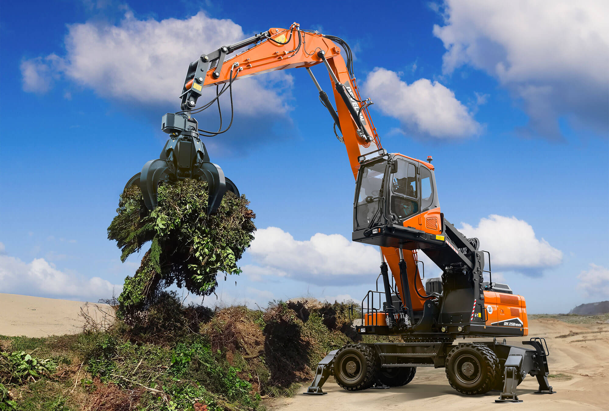 DX250WMH-7 je 25-tonový manipulátor s materiálom v súlade so Stage V na použitie v odvetví pevného odpadu, recyklácie, demolácií a lesníctva.